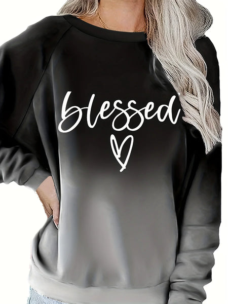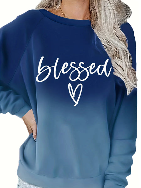 Spring Casual Sweatshirt, Women's Ombre & Letter & Heart Print Raglan Sleeve Round Neck Slight Stretch Pullover Top